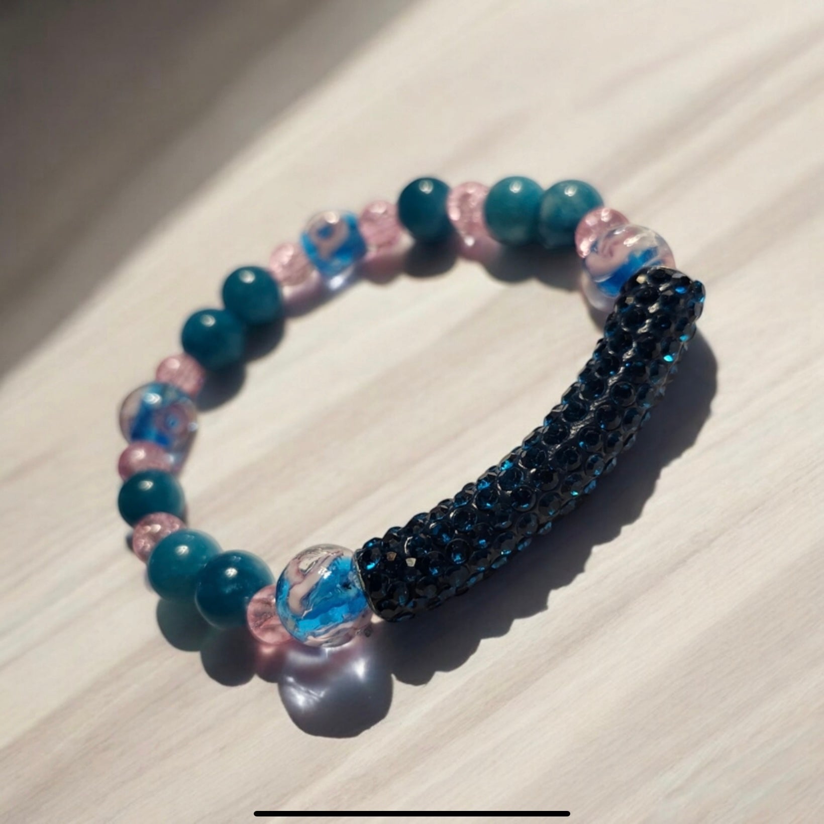 Illuminate your style with our Pink Firefly Glass & Apatite Handcrafted Gemstone Bracelet. Featuring the radiant glow of Pink Firefly Glass beads and calming blue Apatite, this piece exudes charm and tranquility. A decorative teal strass tube adds a pop of sparkle, creating a vibrant contrast that brings out the unique beauty of each gemstone. Perfect for those who love playful elegance with a touch of magic.